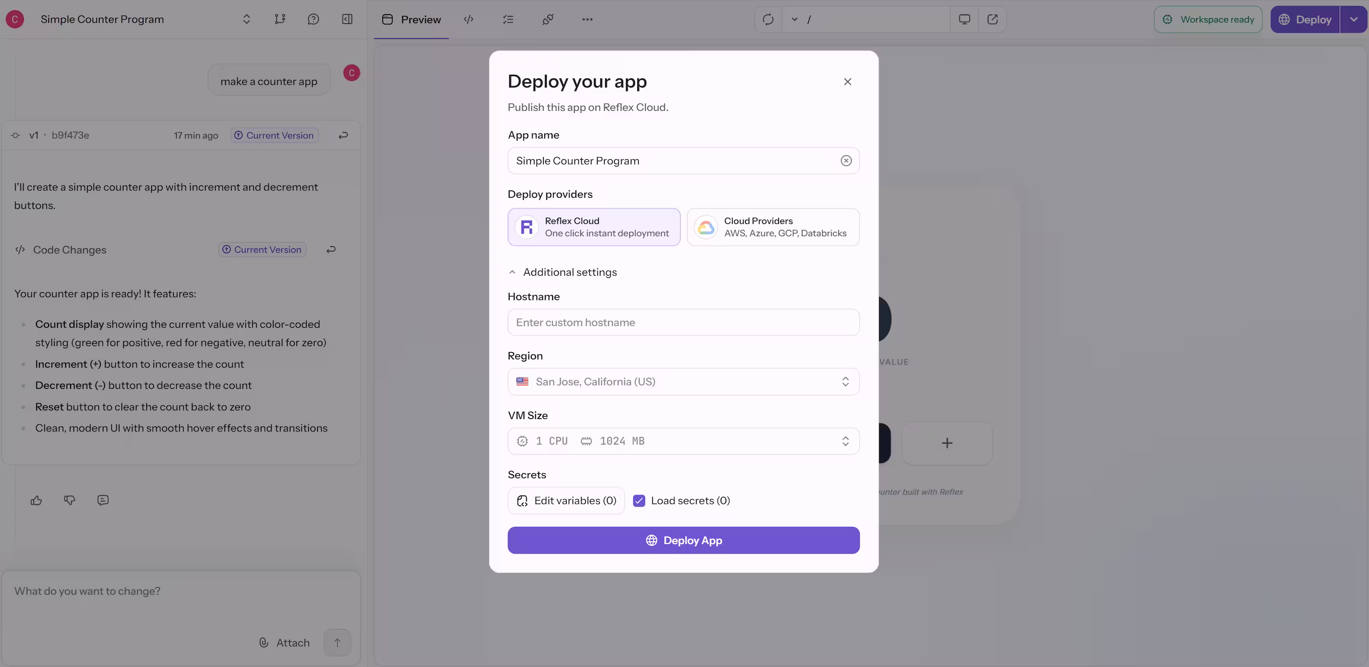 myappas your hostname, your app will be available atmyapp.reflex.run - Region: The regions where your app will be deployed