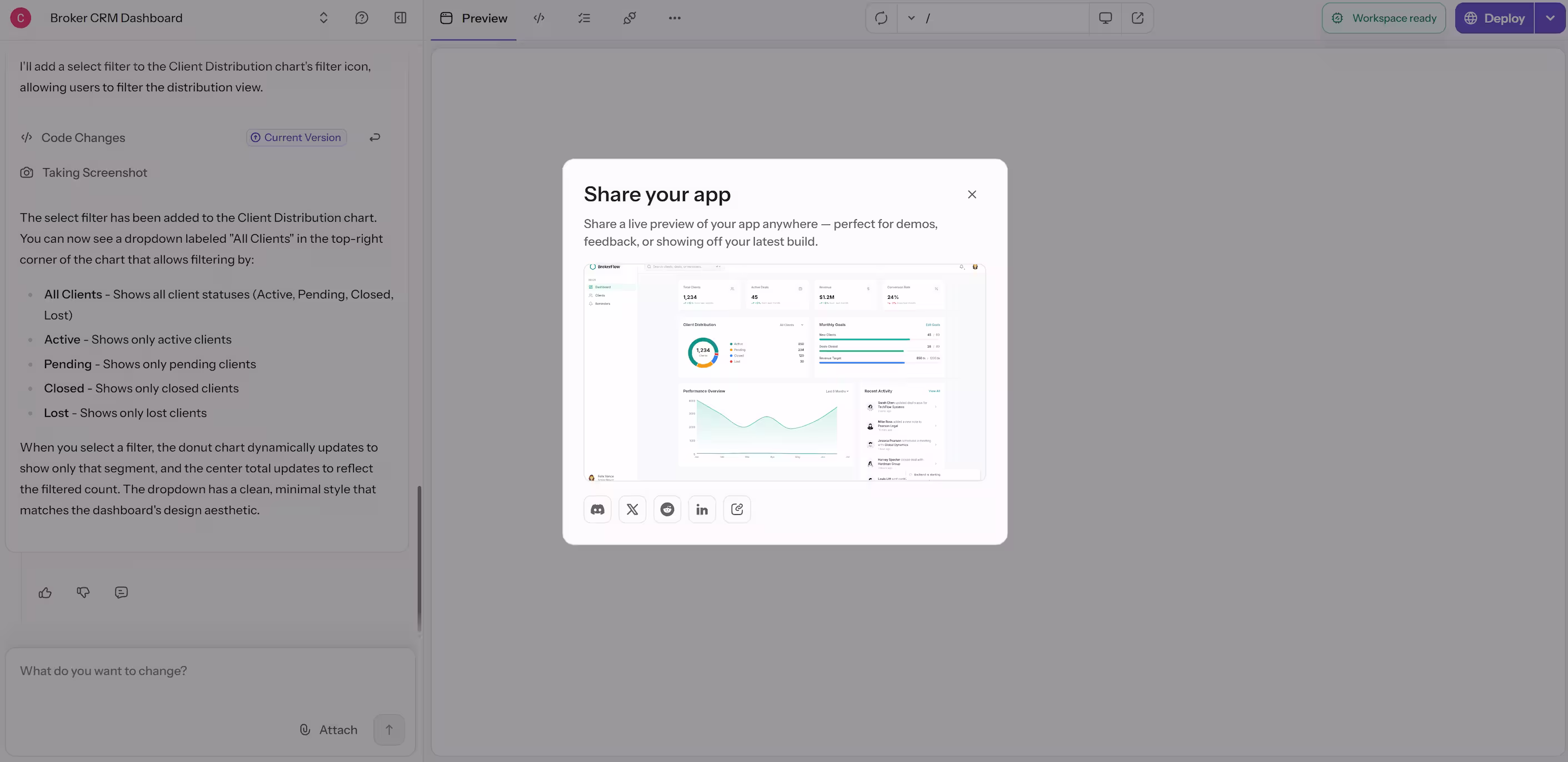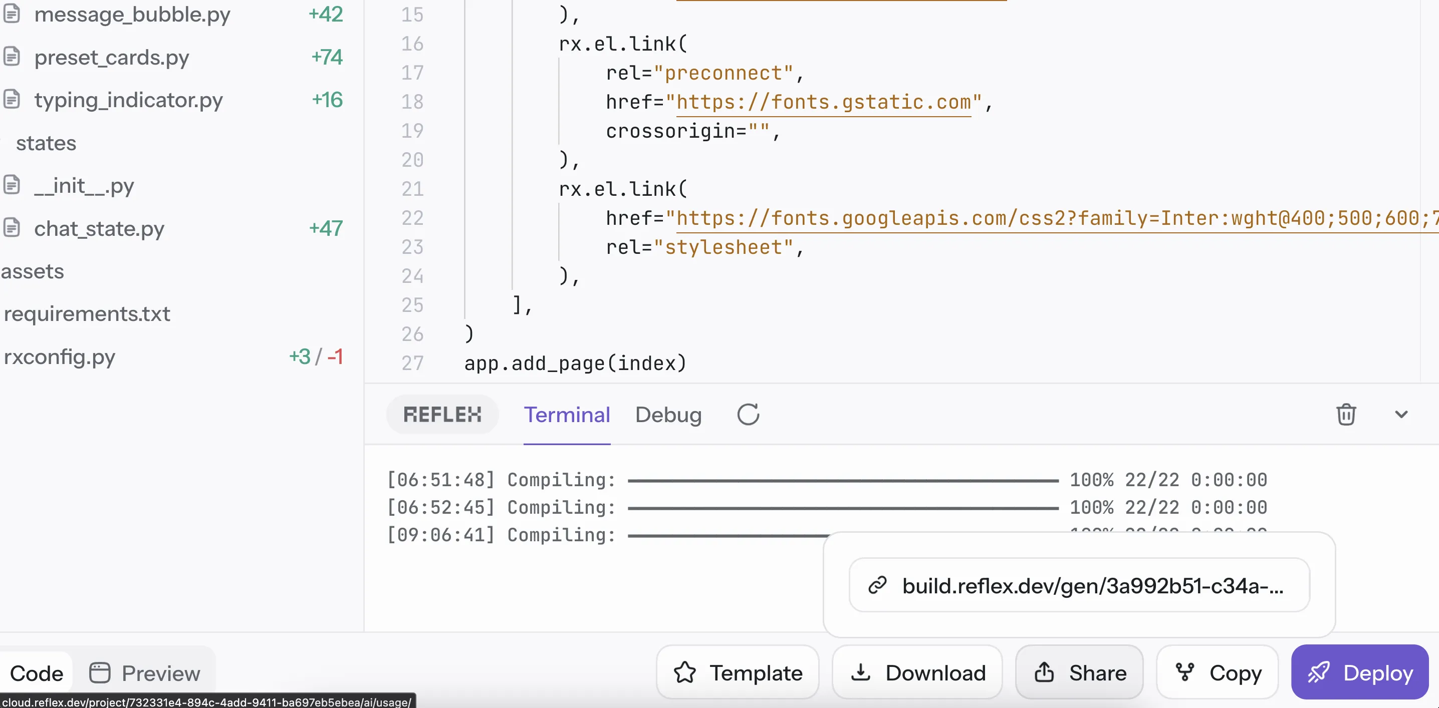 The Share feature makes it easy to show your app to others without deploying it. When you share, Reflex Build generates a unique link that points to the current version of your project in the builder.
